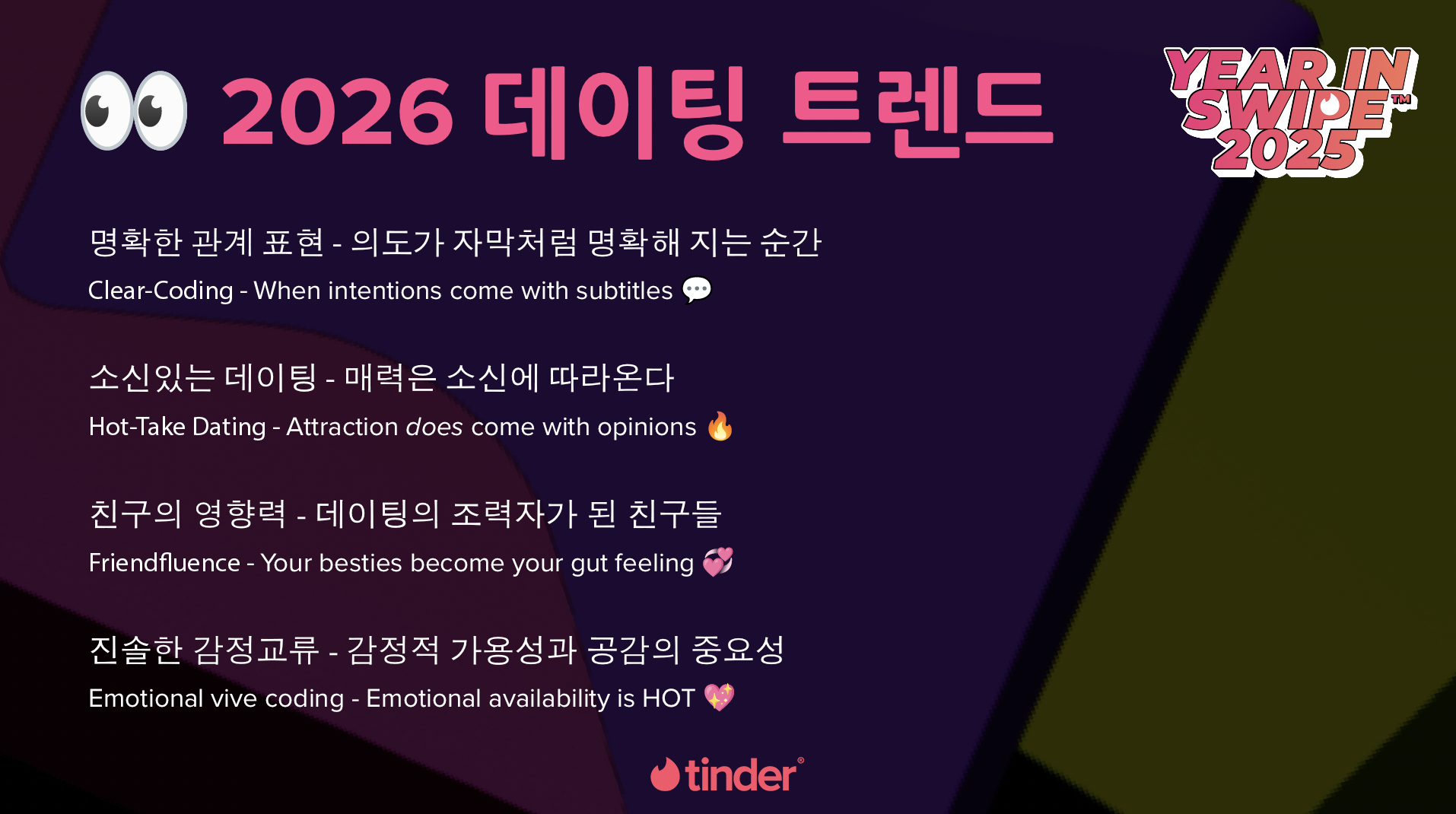 틴더(Tinder)가 올해 전 세계 틴더 이용자들 사이에서 가장 주목할 만한 데이팅 트렌드를 조명한 연말결산 ‘2025 Year in Swipe™’를 발표했다. ‘Year in Swipe’는 틴더 데이터를 기반으로 앱 내 인기 관심사와 MBTI, ‘패스포트’ 기능으로 가장 많이 방문하는 나라 등 한 해 동안의 연애 및 데이트 관련 다양한 이용자 트렌드를 살펴본다. 틴더는 전 세계 이용자 데이터 분석을 통해, MZ세대 싱글들이 혼란스러운 신호를 걷어내고 관계의 본질과 연결의 즐거움을 탐색하고 있다는 트렌드를 공개했다.